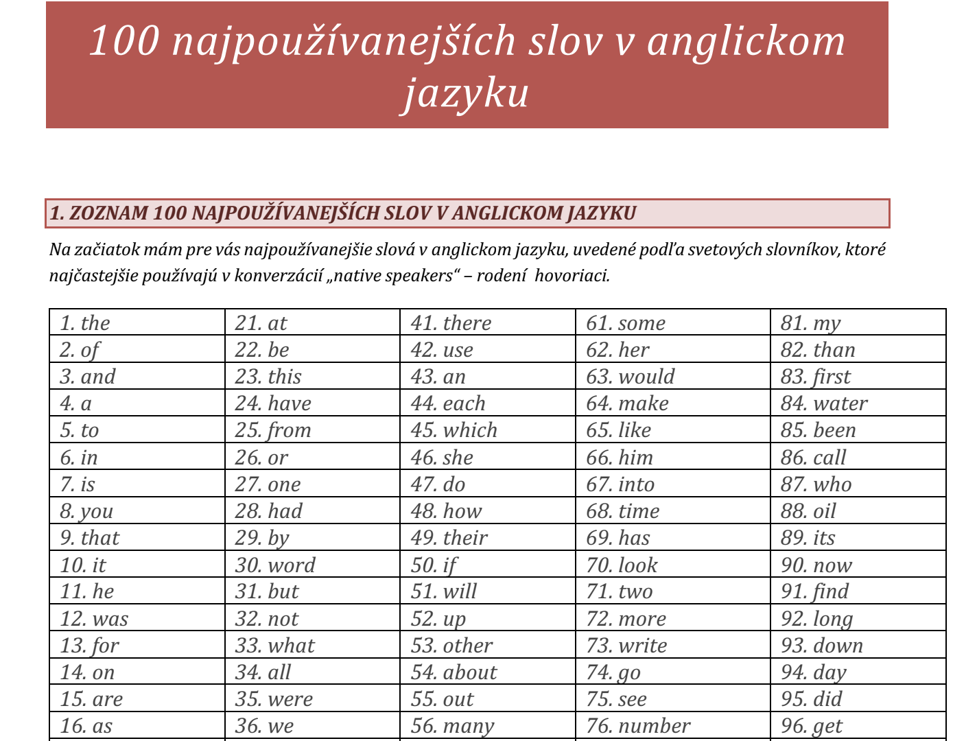100 najpoužívanejších slov v anglickom jazyku